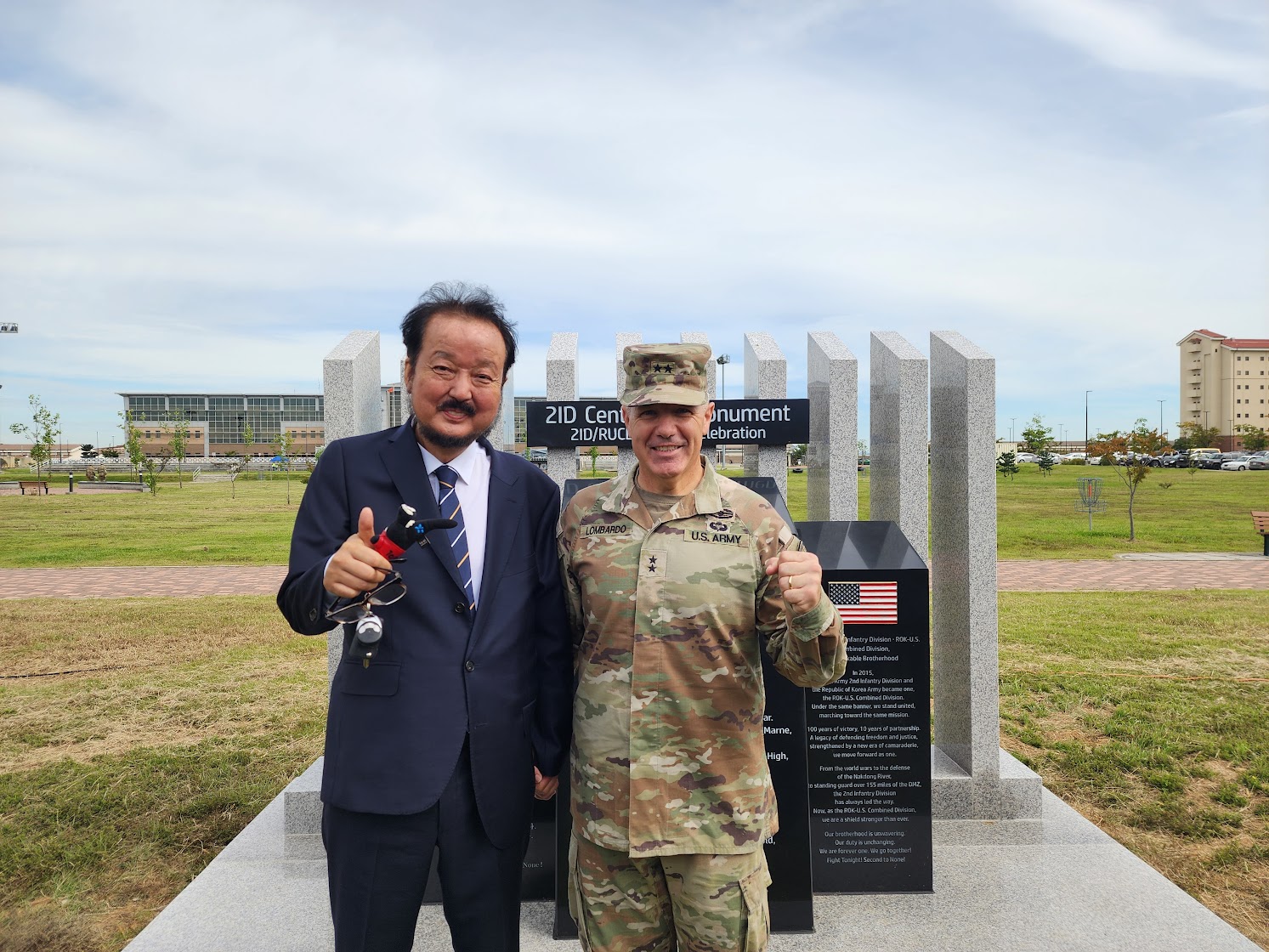 주재현 대표가 미2사단장 롬바르도 장군이 주관한 미2사단 창설 100주년 제막식에 참석하여 서로 오랫만에 진한 우정을 나누었다.